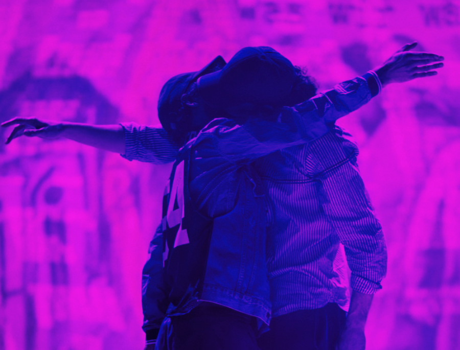 Auf der Bühne hängen Hunderte von Fanschals: Auf ihnen stehen die Namen von Fußballclubs, aber auch Sprüche und politische Parolen. Das Tanzstück Non + Ultras beschäftigt sich mit der Verbindung von Fankultur und politischem Protest. Dafür folgt der Münchner Choreograf Moritz Ostruschnjak der Logik von Social Media: Schnell, laut und bunt wirbelt ein Strudel aus Bildern, Videos, Musik und Bewegung über die Bühne. Acht Tänzer*innen in Jeans und Sportshirts präsentieren einen Tanz voller Energie. Gemeinsam feiern sie ein Fest der Bewegung aus Urban Dance und zeitgenössischem Tanz.