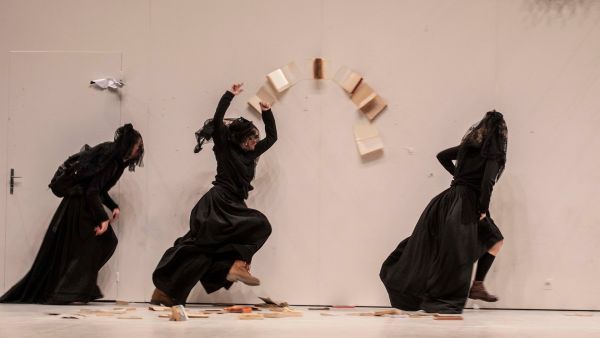 Dans une mise en scène tout en symboles, Jeanne Candel raconte l’histoire d’une femme qui vient de vivre une grande passion amoureuse. Elle est en deuil, dans le charnier de son amour, entourée de ruines. Son lamento sans fin donne à entendre, de l’intérieur, sa souffrance. Et soudain tout bascule, le récit cède la place à la pulsion et au rire. « Si le spectacle était un tableau, dans la première partie, nous le regardons à distance et voyons une image, explique la metteuse en scène. Sa matière, toile et pigments. » Les corps, alors, se libèrent et agissent. Dans un entrelacement de musique et de théâtre, neuf artistes convient à de cocasses visions : un défilé de duègnes espagnoles qui tiennent sur leurs têtes des oeufs, L’Origine du monde de Courbet qui se dévoile entre des cuisses, des personnages qui s’agrafent sur le mur dans d’acrobatiques positions… Un langage des rêves sublimé par les Passions de Heinrich Schütz, librement revisitées par le directeur musical Pierre-Antoine Badaroux. Après Le Crocodile trompeur la saison dernière, Jeanne Candel, artiste associée à la Comédie de Colmar, est de retour avec un spectacle follement vivant.