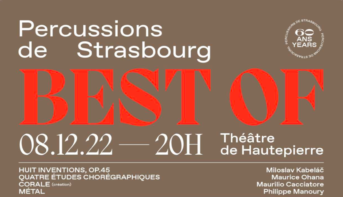 Le jeudi 8 décembre 2022, les Percussions de Strasbourg mettent à l’honneur à la fois des pièces cultes de leur répertoire, dont les interprétations furent nombreuses durant leurs 60 ans d’existence, et une nouvelle création.