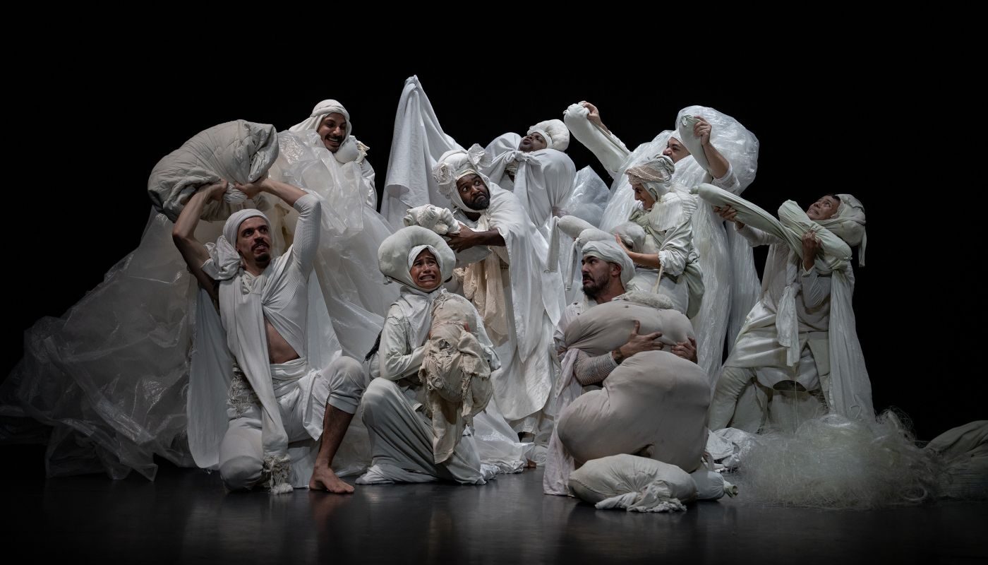 Dans Borda, tout commence par une forme sans forme – donc ambigüe, déjà – blanche étendue de plastique et de tissus amoncelés. Un paysage ? Un organisme vivant ? Sans doute, car voici qu’il bouge, lentement. De cette matrice originelle s’extraient peu à peu des corps, des visages, grimaçant d’abord.