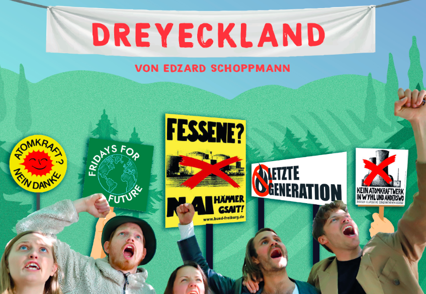 Dans un mélange de fiction et de documentaire, la pièce d’Edzard Schoppmann retrace le début du mouvement écologiste des années 70 jusqu’à la génération actuelle. Un regard particulier est jeté sur la vision enthousiaste des protestataires de l’époque pour le « Dreyeckland » transfrontalier, relié par la langue alémanique commune. Un mouvement de protestation qui a réuni non seulement des Français, des Suisses et des Allemands, mais aussi des groupes sociaux les plus divers.