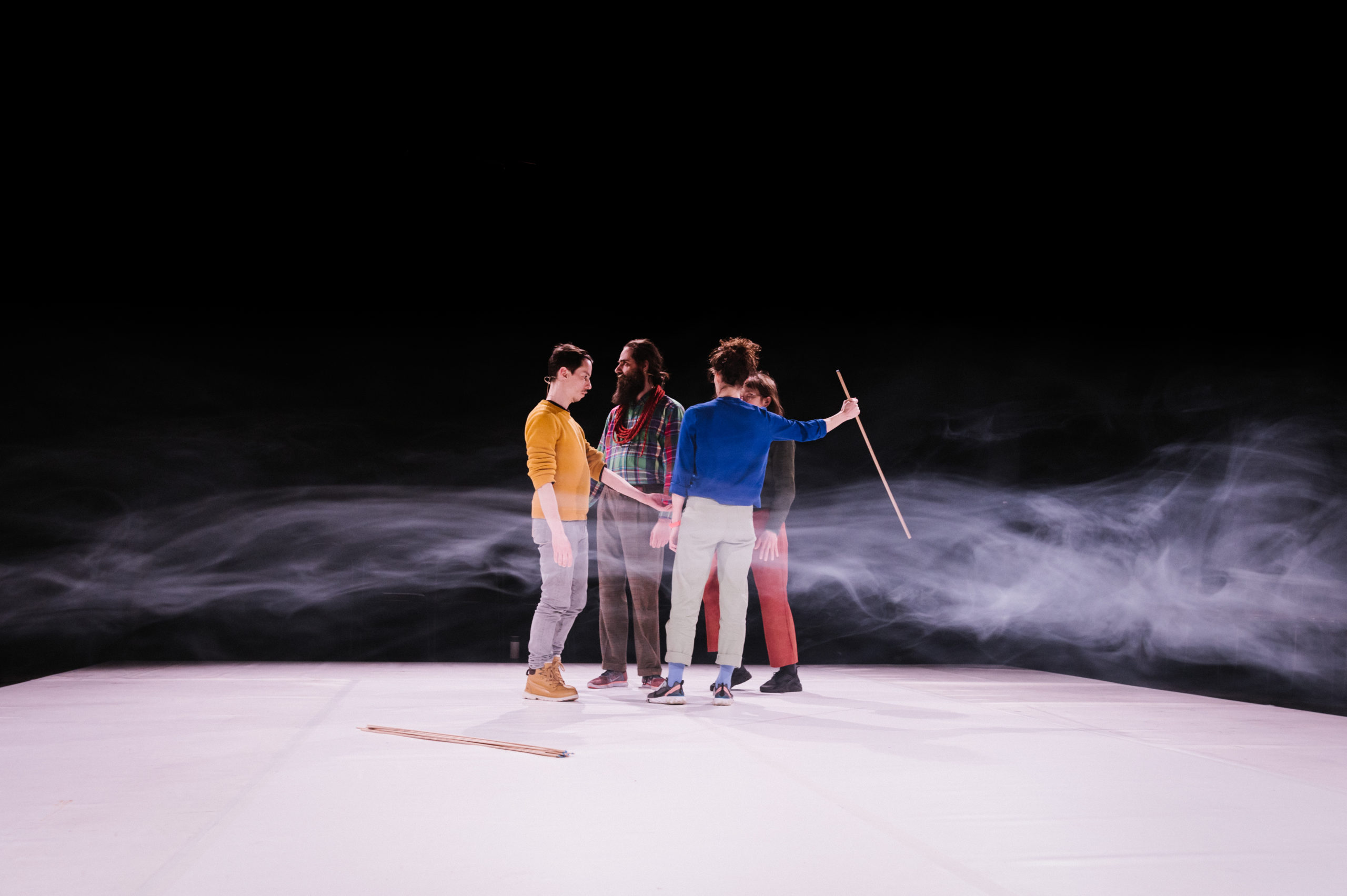 Cet au-delà fascinant est invoqué sur scène par des présences spectrales : à la fois fantômes, phénomènes lumineux ou sonores, elles interrogent les multiples climats qui nous composent. Autour de gestes, récits et images, les interprètes jouent de quelques objets, du brouillard et d’éléments techniques manipulés à vue (projecteurs, enceintes) afin de créer une étrange faune et flore. Ils·elles chantent la langue des lieux disparus, imaginent des danses oubliées… à moins qu’elles ne soient à venir.