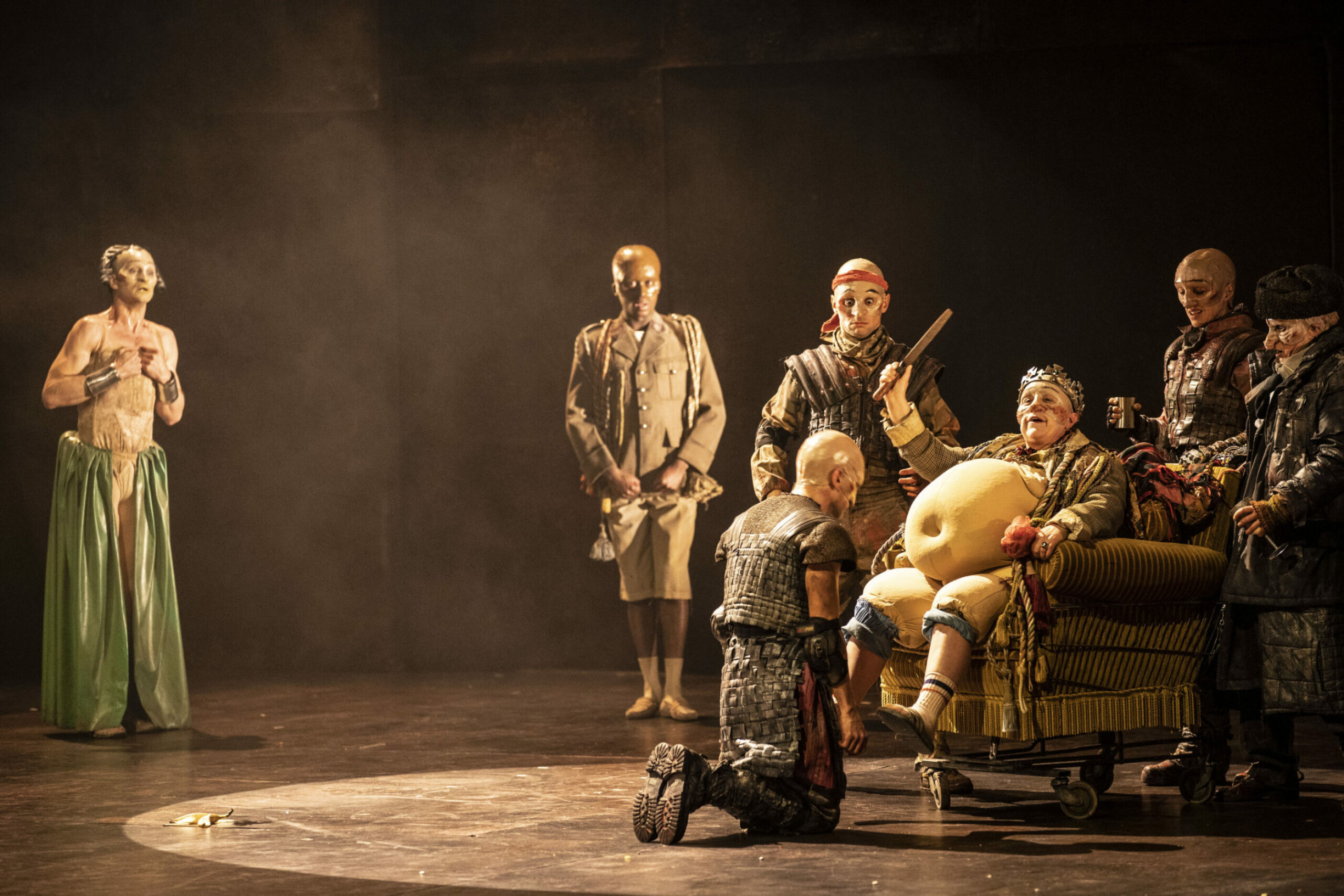 Dans un royaume crépusculaire, où le réel se délite sous l’emprise du fantastique, le Munstrum Théâtre, compagnie alsacienne particulièrement inventive dont nous avions accueilli Les Possédés d’Illfurth il y a trois saisons, livre une relecture saisissante de Macbeth. Fidèle à son univers hybride, mêlant théâtre, masques et marionnettes, la compagnie transcende la tragédie shakespearienne pour en révéler toute la folie hallucinée. Sous la direction de Louis Arene, les figures du pouvoir prennent des allures grotesques et inquiétantes, tandis que les trois sorcières deviennent d’étranges entités protéiformes, sculptant le destin du couple maudit. Les corps se métamorphosent, les visages se figent en rictus démesurés, et le sang versé s’imprime dans une scénographie grandiose. Porté par une esthétique à la croisée du baroque et du cinéma expressionniste, ce Makbeth revisité nous entraîne dans un cauchemar éveillé, où l’illusion et la fatalité s’entrelacent jusqu’à la chute inéluctable du tyran.