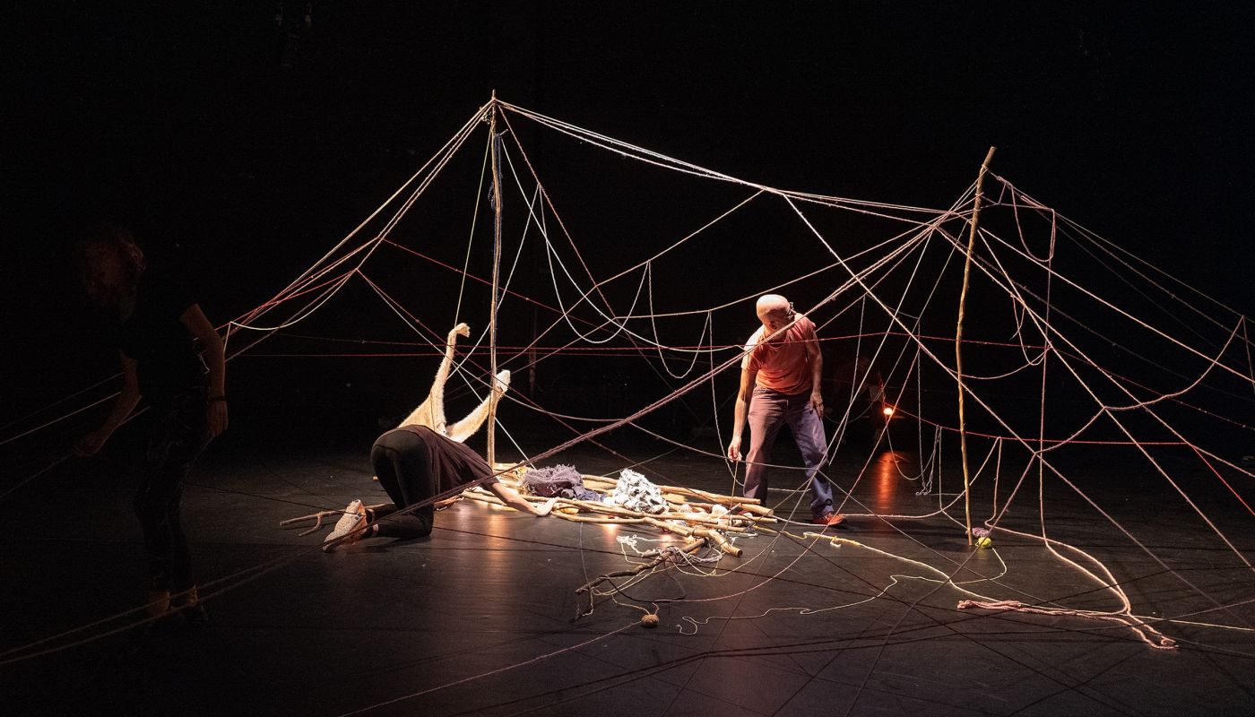 Bâtir du commun, bâtir en commun : telle est l’expérience sensible à laquelle invite Ivana Müller. Dans mirages et tendresses, danseuses et performeurs font ensemble l’expérience concrète de la construction. À l’aide de branches de noisetier et de fils de laine colorés, sur une scène nue, entourée du public, ils et elles échafaudent ensemble une structure, tissent un espace inédit et indéfinissable. Ni un parlement, ni une cathédrale. Un chantier utopique car inutile, c’est-à-dire échappant à l’impératif de l’utilité, avec comme ciment la solidarité, relation essentielle et trop souvent oubliée, qui implique avant tout l’écoute et l’attention à l’autre. Défaire un nœud devient un projet collectif, maintenir un équilibre instable une nécessaire collaboration.